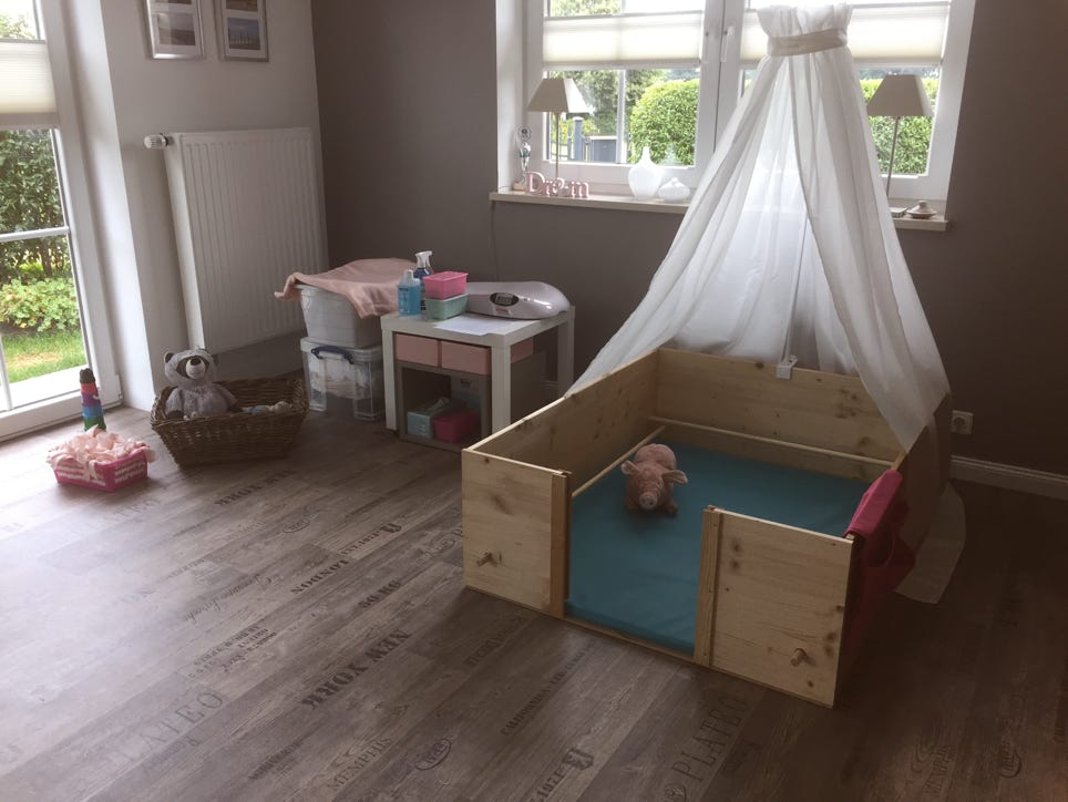 Mit etwa drei Wochen zeigen wir den Welpen auch die Welt außerhalb der Wurfkiste. Mit vier Wochen können die Kleinen, die ersten Ausflüge in unseren Garten unternehmen. Der Welpenspielgarten ist zum Teil überdacht und erhält von mir zusätzlich viel Spielzeug, welches nach Bedarf gewechselt wird.